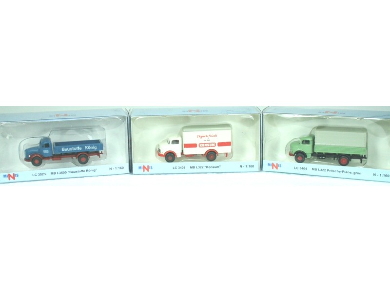 Autoset 5 Spur N 1:160, 2 Fahrzeuge MB LKW L322 in den Ausführungen Koffer Konsum Pritsche mit Plane, 1 MB L3500 Baustoff König