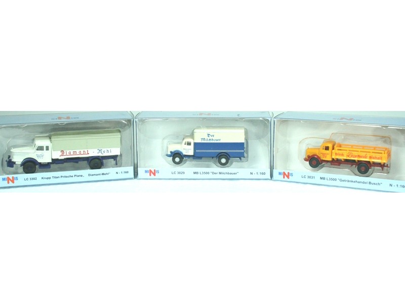 Autoset 8 Spur N 1:160, 2 Fahrzeuge MB LKW L3500 mit Aufdrucken Der Milchbauer und Getränkehandel, 1 Fahrzeug Krupp Titan mit Diamant Mehl