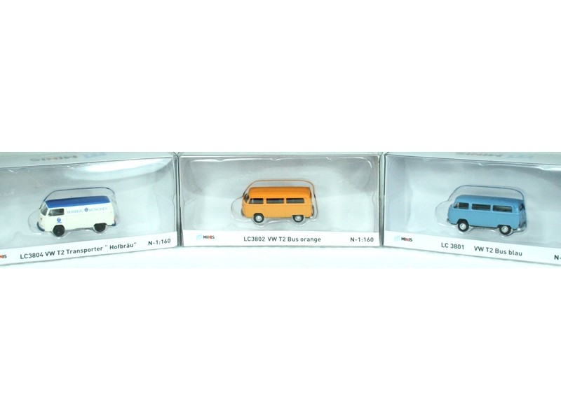 Autoset 14 Spur N 1:160, 1 Fahrzeug Opel Blitz mit Aufdruck Reissdorf Kölsch, 2 Fahrzeuge VW T2 Bus orange und Edeka