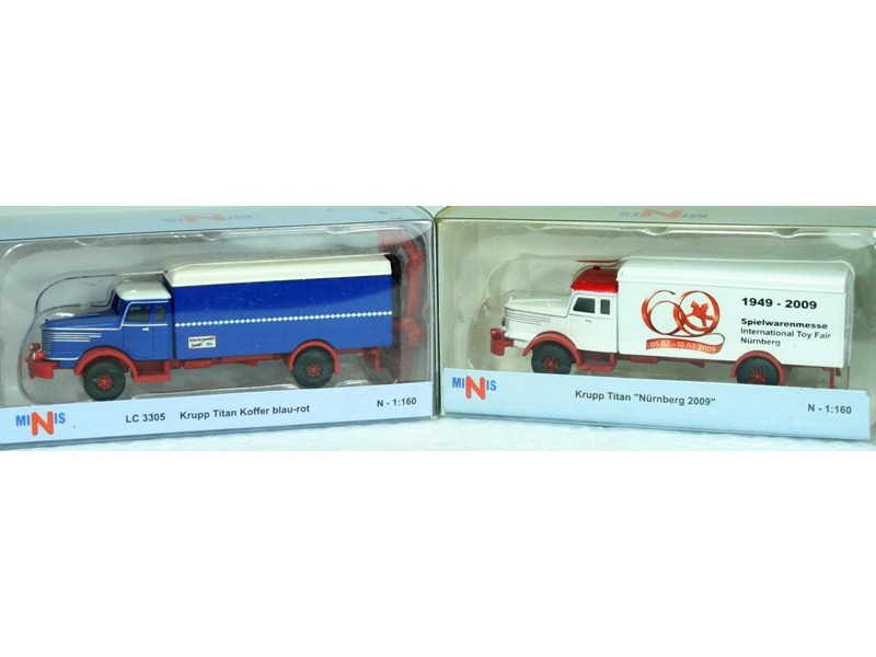 Autoset 16 Spur N 1:160, 2 Fahrzeuge Krupp Titan mit Koffer blau-weiss und Spielwarenmesse