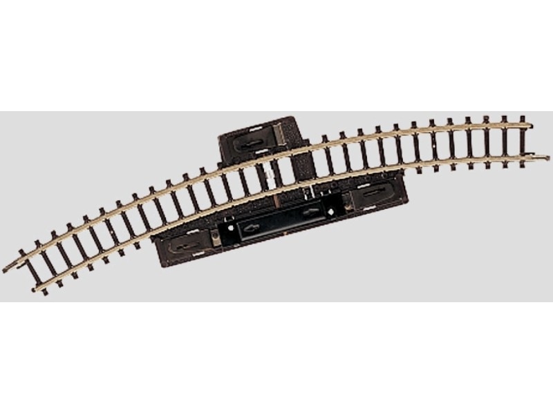 Schaltgleis gebogen, Radius 220 mm, 30°, mit Anschlussklemmen. Fahrender Zug löst Schaltfunktion aus.