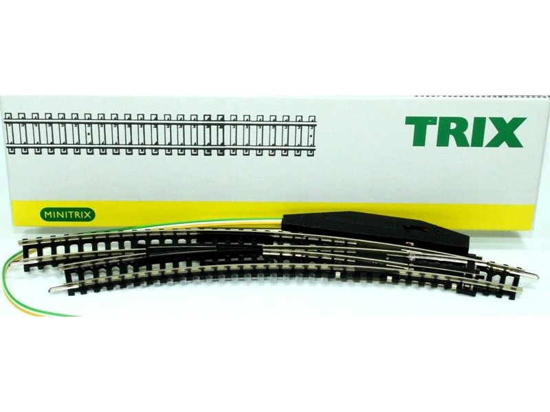 Minitrix, Bogenweiche elektrisch links für die Radien 3 und 4, Weichenbogen entspricht 30°, Stopp-Weichen-Funktion wahlweise.