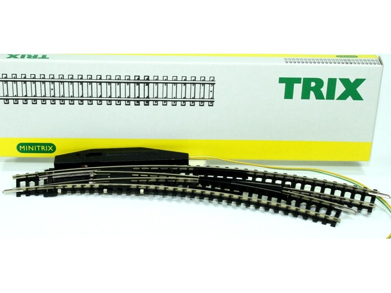 Minitrix, Bogenweiche elektrisch, rechts, für die Radien 3 und 4, Weichenbogen entspricht 30°, Stopp-Weichen-Funktion wahlweise.