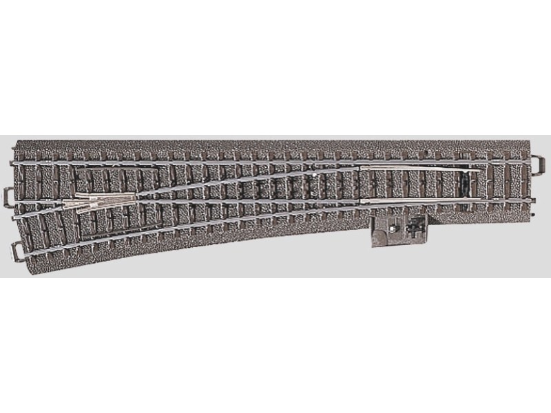 C-Gleis. Schlanke Weiche links, Länge 236,1 mm, Zweiggleisradius 1114,6 mm / 12,1°. Herzstück 10° aus Metall. Am Ende der Weiche werden 2 Gleise 24071 benötigt, ein passendes Böschungsteil liegt bei. Mit Handschalthebel.