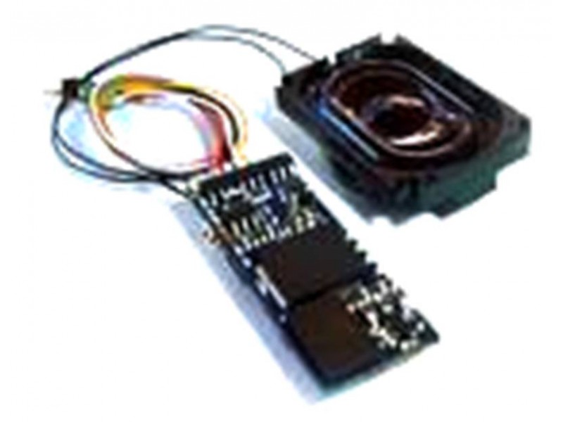 Universalgeräusch zum Selbstprogrammieren, LokSound micro V3.5, NMRA/DCC mit 14, 28, 128 Fahrstufen, 2-stellige + 4-stellige Adressen, Motorola mit 14 Fahrstufen (kein ANalog AC!). Selectrix System. Größe: 28,5 x 10 x 5 mm. Lautsprecher mit 16x25 mm enthalten.