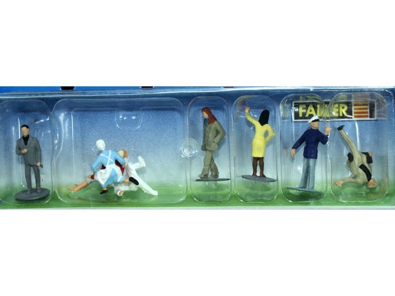 Unfallszene mit 8 Figuren, davon 4 mit Standfuß, 1 Notarzt, 1Schwester mit Unfallopfer, 1 Passant.