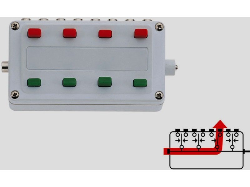 Zum Schalten von 4 zweispuligen Magnetartikeln wie Weichen und Signalen oder bis zu 8 Entkupplungsgleisen. Anzeige der betätigten Taste über den Stand der jeweiligen Tasten. 8 rückseitige und 2 seitliche Buchsen für neue Stecker, 8 liegen bei. Größe: 80 x 40 mm.