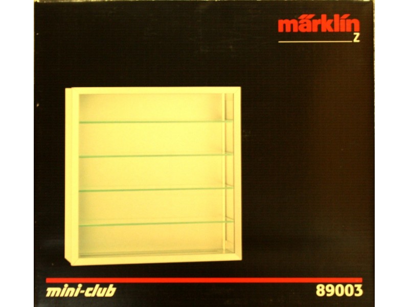 Präsentationsvitrine für die Spur Z (auch für N). Stabile Metallausführung, Rahmen aus silberfarbig eloxiertem Aluminiumprofil, Rückwand aus silberfarbig eloxiertem Aluminiumblech, 5 Fachböden aus Floatglas, Breite 400 mm, Höhe 400 mm, Tiefe 80 mm.