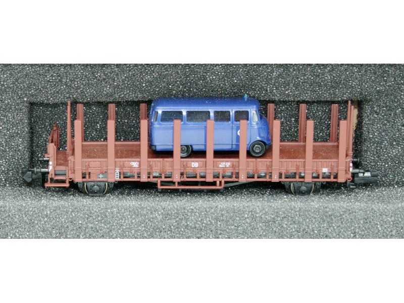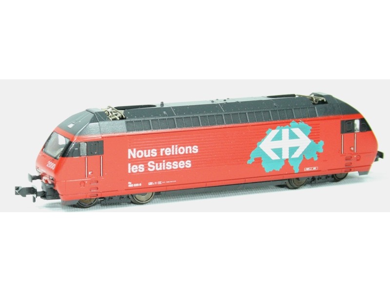 Elok BR 460 035-9, SBB, DSS, Dreilicht-Spitzenbeleuchtung, Motor mit Schwungmasse, Antrieb auf beide Drehgestelle, Stromaufnahme auch über Oberleitung. Zusätzlich Minitrix Schiebedachwagen, 99991, lange Ausführung und Minitrix Rungenwagen, Sonderserie, 99988, beladen mit VW-Bus.